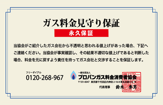 当協会がご紹介するのは、適正な料金体系を維持する優良なガス会社のみです。さらに、契約後も不当な値上げがないかを永久的に監視する「ガス料金見守り保証」をお付けしているので、安心してご利用いただけます。