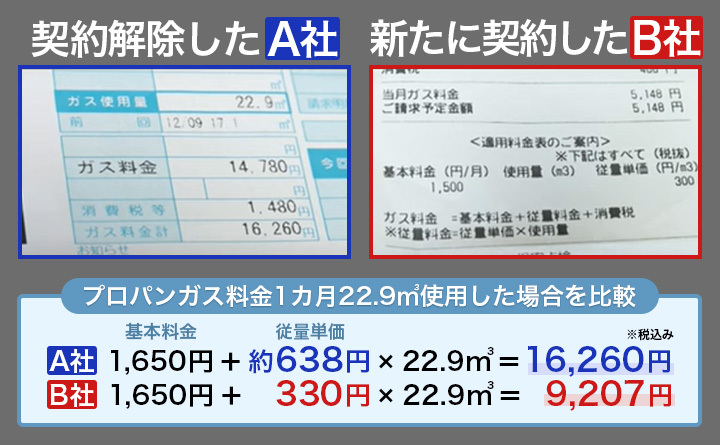 そこで、鈴木さんはプロパンガス料金消費者協会に相談し、今までの会社から良心的なガス会社に乗り換えました。新旧の両ガス会社を比較すると、同じ22.9立方メートル使用した場合、合計の支払額が16,000円 → 9,000円に、月7,000円も節約できました。