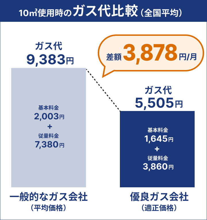 同じプロパンガス、同じ使用量なのに、一般的なガス会社の平均価格(※)と優良ガス会社の適正価格を比べると、ガス料金に大きな差があります。