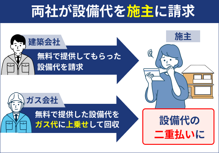 ガス会社は、無料で提供した給湯器代などを回収するために、ガス代に上乗せをして請求します。建築会社は、無料で提供された設備なのに「給湯設備一式」等の名目で請求します。