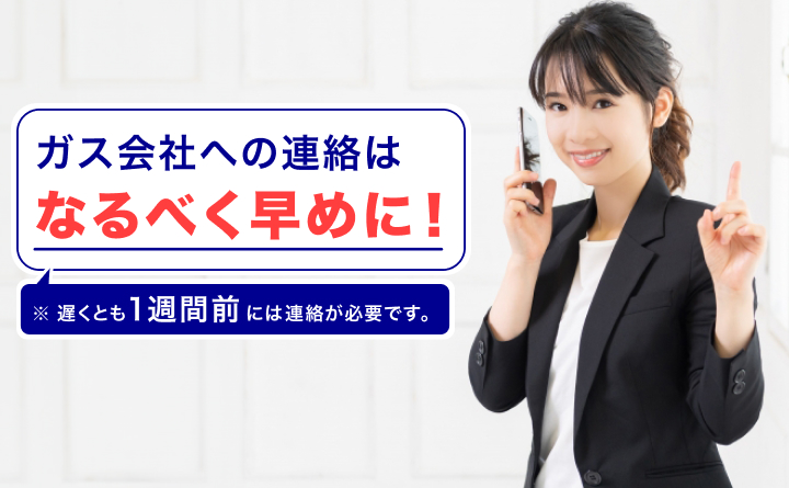 引っ越し日時が決まっているのであれば、遅くとも1週間前までなど、できるだけ早い段階で新しいガス会社に連絡しておきましょう。