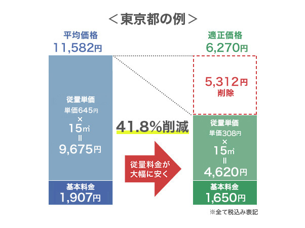 上記は東京都の例です。「石油情報センター」によると、東京都の平均価格(2025年8月現在)は基本料金1,907円で、1m3当たりの従量単価は648円です。一方、協会が適正とする東京都の適正価格(2025年9月現在)は、基本料金1,650円で1m3あたりの従量単価308円です。